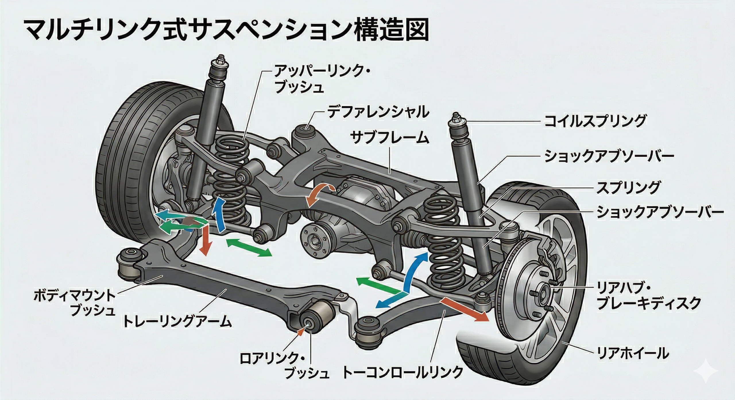 室内空間とエンジンルームへの影響(一部): 複数のアームを配置するためのスペースが必要となり、特にFF(前輪駆動)車ではエンジンルームが狭くなるなど、パッケージングに制約が生じることがあります。