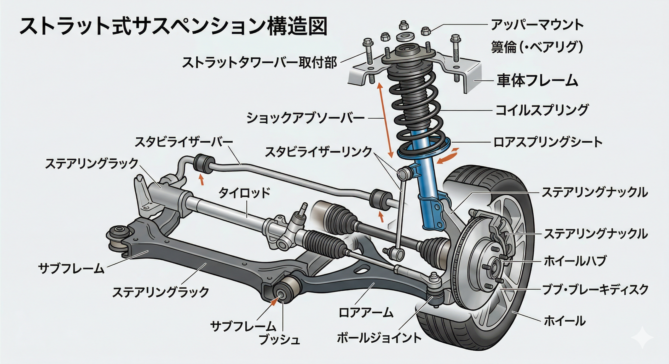自動車の「走り」や「乗り心地」を決定づける重要な要素、サスペンション。ダブルウィッシュボーン、マルチリンク、トーションビームなど様々な形式がありますが、現代の乗用車において最も普及しているのが**ストラット式サスペンション(マクファーソン・ストラット式)**です。